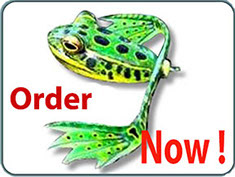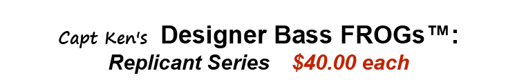 The FROGs in the photos above and below are the Replicant Series: Southern Leopards in Dark Green, Light Green & Light Golden. Since they are computer graphics, they always look the same for a given species & model, except that the bellies can be painted custom in such sold colors as yellow, white, black, or combinations of colors & spots or mottled effects. Some folks choose GLOW in the Dark for night fishing or black for night fishing on a full moon against a bright surface.