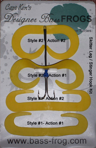 All of the Designer Bass FROGs™ can also be used with another type of leg called the "Skitter Leg" which will allow you to "buzz" your FROG over the surface to cover more water, searching quickly for more aggressive bass. There are 4 different Skitter Legs in the Skitter Leg / Stinger Hook Accessory Kit, yielding 8 different gurgling actions, depending on whether you attach them with the legs positoned "up" or "down". There is also an optional "Stinger" Hook that attaches in seconds, and if a bass tries to target "just" the legs, the Stinger will get them almost every time. In the photo above, the Stinger Hook is "Texas rigged" to be more weedless.