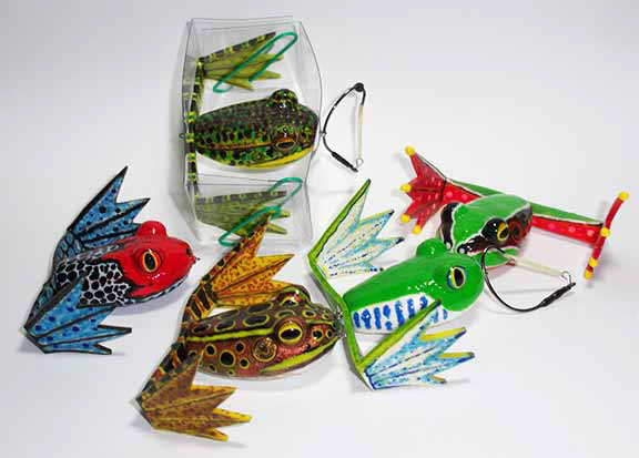 All of the Original Series Designer Bass FROGs™ in the photo below have their matching standard, high detailed, hand painted legs for each of these real species of FROGs. The Dark Green Bull FROG at the top is wearing a set of "Leg Trainers" that keep the proper positioning for a FROG leg's optimum swimming action. All Orignal Series & Replicant Series Designer Bass FROGs™ come with their own set of Leg Trainers that should be worn when not fishing.